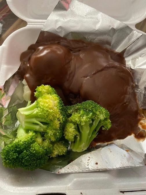 Ground beef topped with brown gravy and onions. Served with 2 side dishes and a dinner roll or cornbread