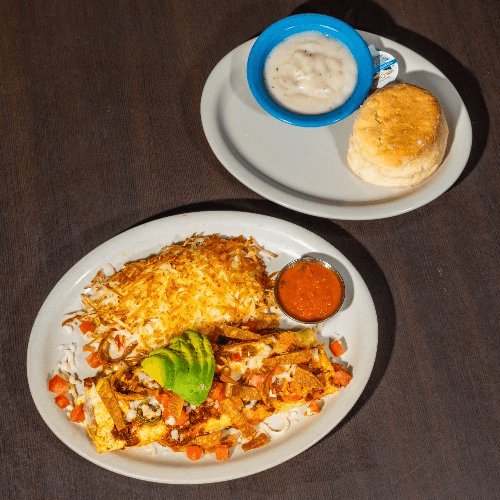 Hash browns, chorizo, bell peppers, onions, cheese, topped with two eggs any style, tortillas, toast or biscuit & gravy