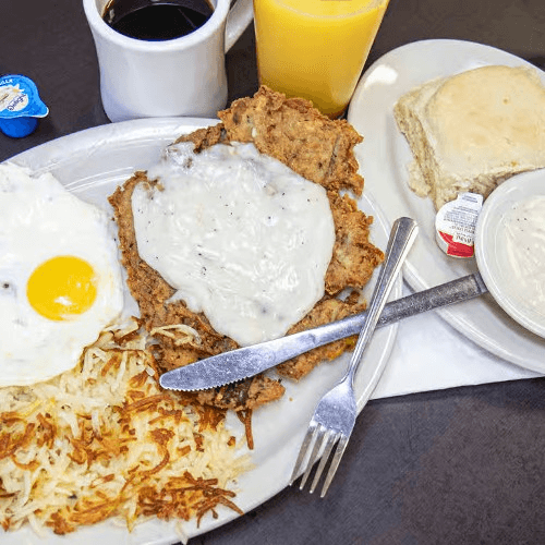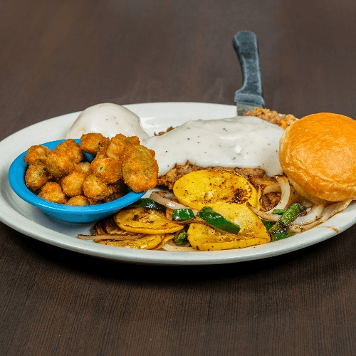 Red potatoes, onions, bell peppers, cheese, topped with chicken fried steak, gravy, two eggs any style, toast or biscuit & gravy