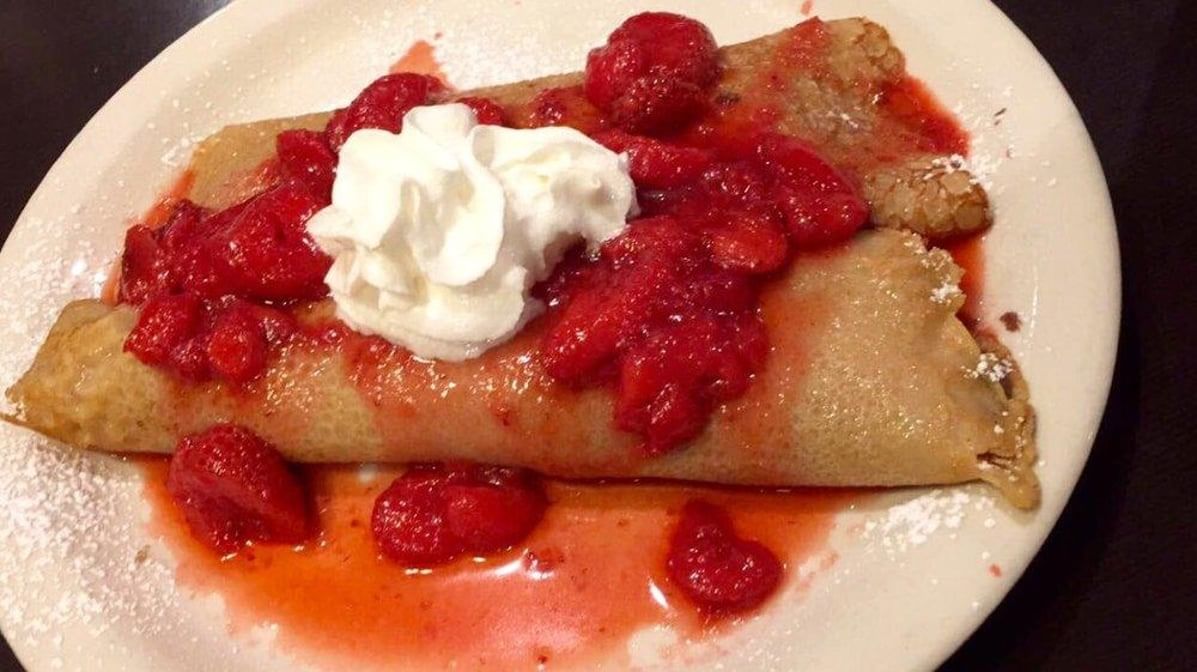 Served with 2 eggs, 2 strips of bacon or 1 sausage patty, hashbrowns, and 1 crepe filled with either blintz or nutella chocolate filling