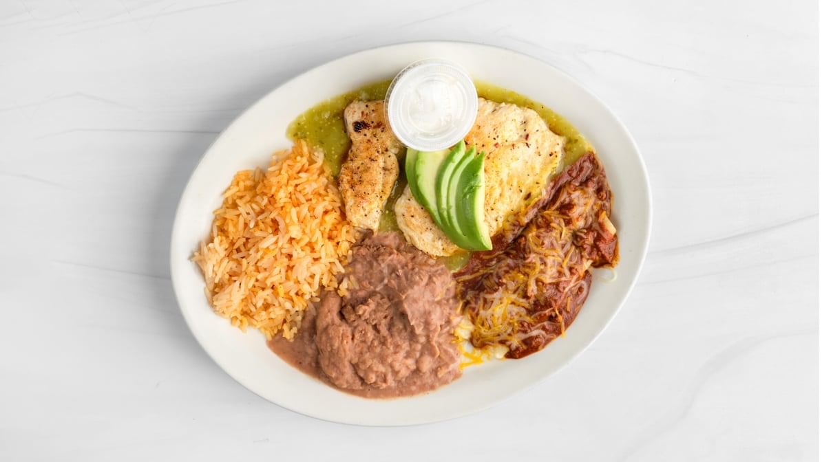 Grilled lemon pepper chicken breast, served on salsa verde and 1 cheese enchilada, rice, beans, sliced avocado & sour cream. Served with chips and salsa, rice and beans