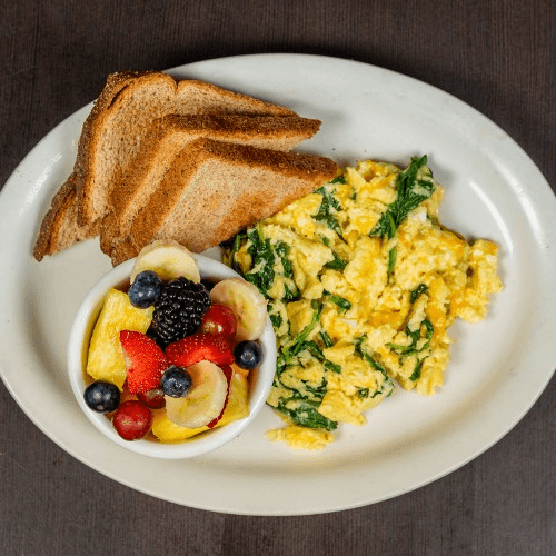 2 scrambled eggs with spinach and cheese, fresh fruit & wheat toast