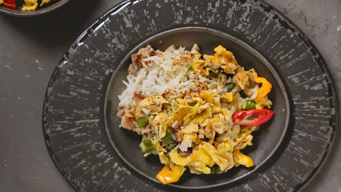 Roast beef and scrambled eggs with tortilla chips, jalapeños, cheese, onions, and tomatoes. Served with hash browns or home fries and tortillas